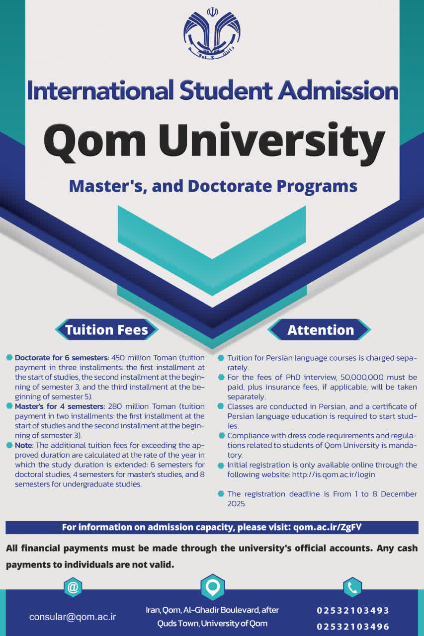 تفتح أبواب التسجيل من يوم 10 الى 23 آذر الموافق أول ديسمبر لغاية 14 ديسمبر عن طريق موقع 7 qom.ac.ir/ZgF. يجب أن تُدفع جميع الرسوم المالية عبر حسابات الجامعة الرسمية فقط.  ولا یقبل دفع أی مبلغ خارج الإطار الحسابات الرسمیة.
